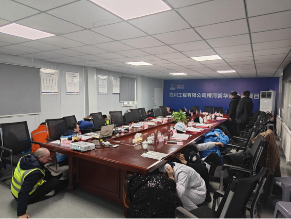 2024年1月30日下午,县应急管理局工作人员在精河新华能源四川电建工程部指导开展地震应急演练。演练分两部分,先进行桌面推演,模拟精河县发生6.0级地震,地震造成2人受轻伤,同时对光伏设施及附属设备造成损坏,工程部立即启动地震应急预案,开展四级响应。工程部各应急小组迅速行动,有条不紊开展应急救援工作。各司其职,又相互配合。桌面推演,其目的是让各应急小组和队员们牢记职责和使命,在实战中更科学地救援。其后,开展室内应急避险和室外疏散逃生演练。共46人参加。县应急管理局党委书记、副局长余志勇,针对安全生产工作,提出三点要求。阿合其农场卫生院医护人员,现场进行了医疗救护知识培训,演示心肺复苏术和除颤仪使用方法。县发改委能源办主任张磊,地震地质工程齐建检查指导。