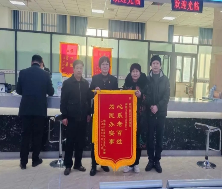 近日,精河县精河镇锦福社区居民王金凤在回到精河县的第一时间和家人来到精河县医保局服务窗口送来一面锦旗。王金凤紧紧地拉住郝静的手说:“真是太感谢了,为你的热心付出点赞。”