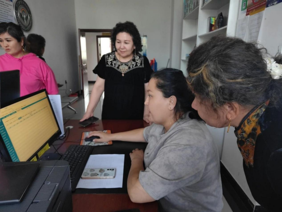 “手机扫码点我要交费,输入您的信息,点下一步选缴费档次就能交费成功了”,工作人员昆都孜向前来交费的阿米娜说道。