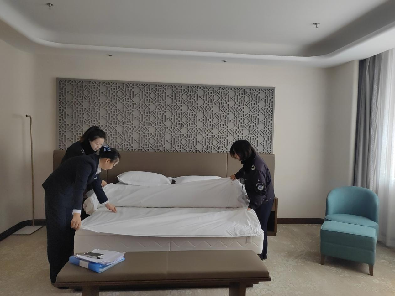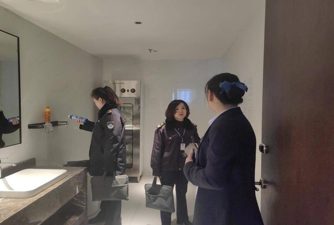 执法人员从酒店的卫生管理措施落实情况、公共场所卫生许可证持证公示、卫生管理档案、从业人员健康体检、集中空调通风系统卫生管理和公共用品用具清洗、消毒、保洁等方面开展了实地查看,并对酒店布草间、消毒间进行了重点检查,同时指导酒店工作人员做好布草消毒工作,确保布草清洗、消毒、转运全流程的卫生安全。针对检查中存在的问题,执法人员当场下达监督意见书,要求立行立改,及时消除隐患,确保与会人员有一个安全、清洁、舒适的住宿环境。