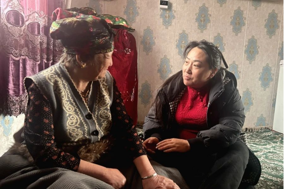 在交流过程中,李静书记注意到霍加肯巴依·久马古勒爷爷因近期天气变化,老毛病又犯了,行动不便,便贴心地叮嘱老人要注意保暖,及时增减衣物。牧业队五台社区干部帮爷爷查看了他近期在喝的药并叮嘱老人家喝药期间的注意事项。她们详细记录了老人的需求,承诺会尽快联系社区医疗志愿者为老人提供上门健康检查和康复指导服务。