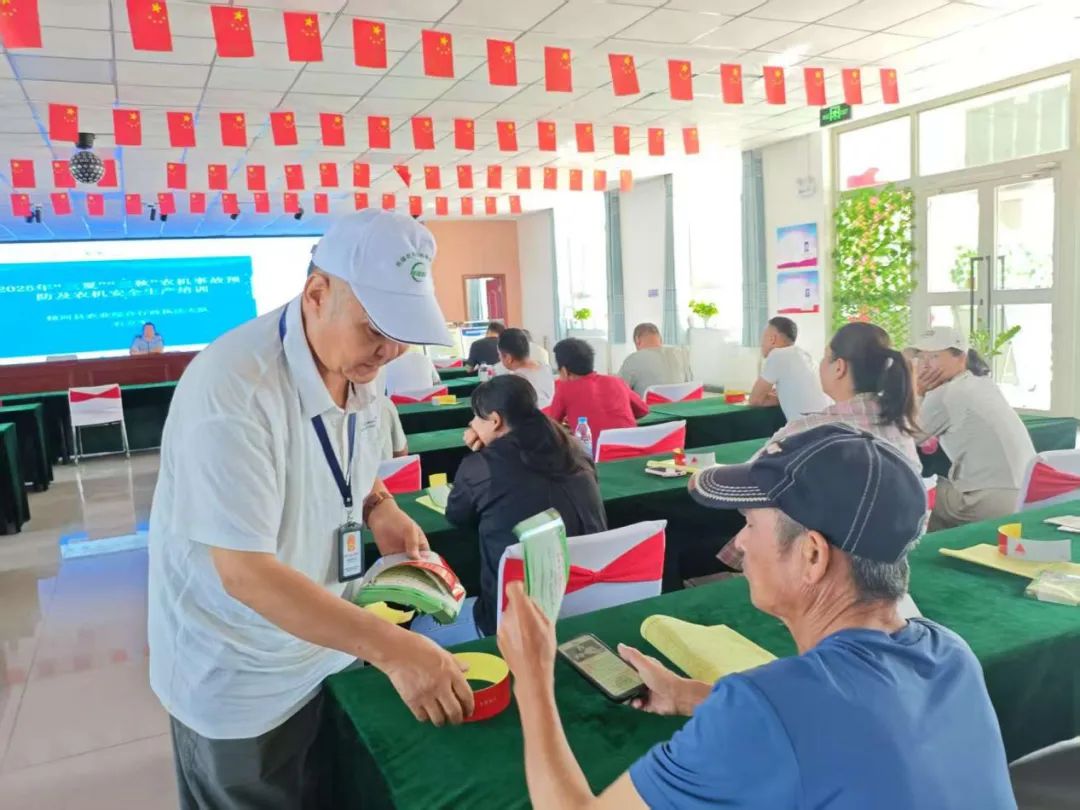 同步开展的“2025年‘三夏’‘三秋’农机安全生产培训”吸引众多农机手参与。培训中,学员首先观看自治区制作的“农机安全警示教育片”,随后专业人员围绕农机驾驶操作规范、日常维护保养要点、常见故障排除技巧及农忙时节安全生产注意事项等内容进行系统授课。通过“理论讲解+现场演示”的方式,帮助学员掌握实用技能,现场设置的互动问答环节更是激发了学员积极性,形成浓厚的学习氛围。