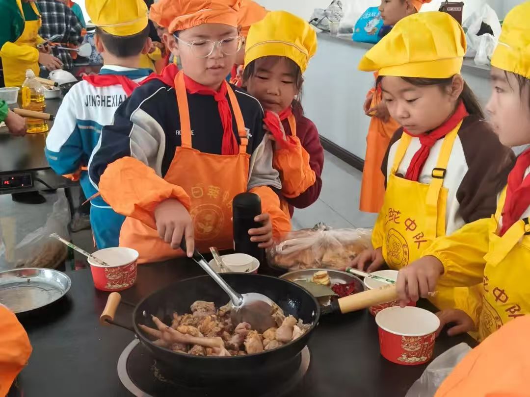 劳动的价值,在从田畴到灶台的延伸中得到了升华。在县第一小学的烹饪基地,孩子们化身“小厨神”,围绕在灶台旁忙碌。随着鸡肉在锅中滋滋作响,土豆逐渐软糯,辣椒与香料的香气瞬间激活了所有人的味蕾。孩子们争相尝试调味,在“盐少许”与“糖适量”的反复实践中,领悟着“火候”与“平衡”的生活奥秘。当第一锅凝聚了集体智慧的大盘鸡热气腾腾地出锅时,全班的欢呼声此起彼伏。