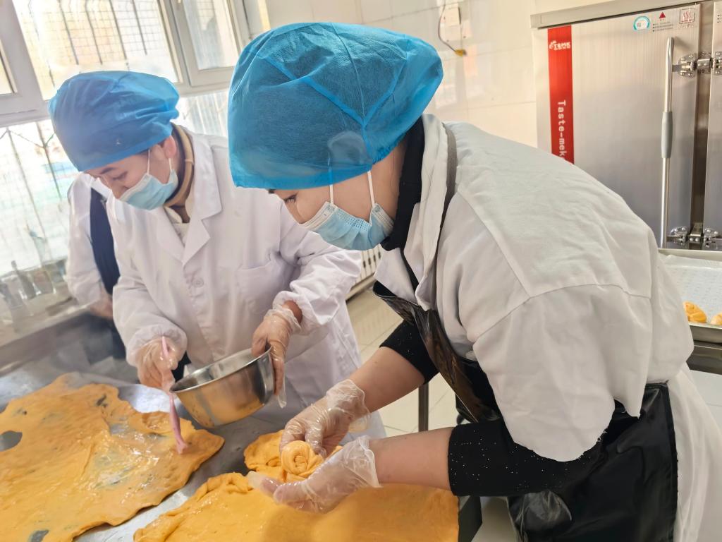 食堂工作人员们化身“创意面点师”,以菠菜、胡萝卜为天然色素,巧手制作出各式各样色彩缤纷、造型可爱的花卷。从和面、揉搓到成型、蒸制,每一个环节都展现了她们娴熟的技艺与创新的热情。