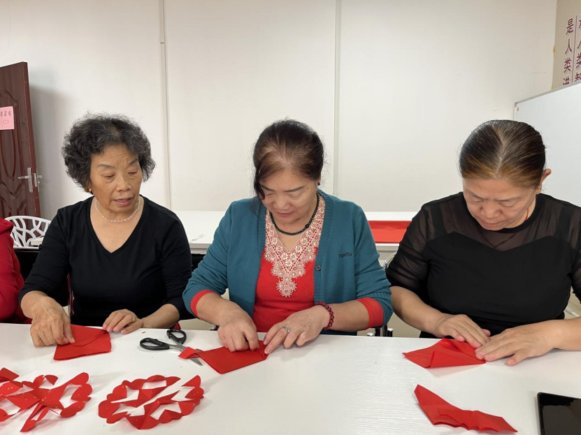 活动特别邀请了社区文化骨干司淑英阿姨,为大家讲解剪纸艺术的历史背景、基本技法和吉祥图案的寓意。随后,工作人员发放了红纸、剪刀等工具,居民们围坐在一起,互相交流、共同协作。有的认真描摹纹样,有的精心剪刻细节,现场氛围温馨而融洽。在欢声笑语中,一张张红纸逐渐变成了一幅幅生动的窗花、灵动的花鸟以及象征民族团结的剪纸作品。大家纷纷展示自己的成果,分享创作心得,脸上洋溢着喜悦与自豪。