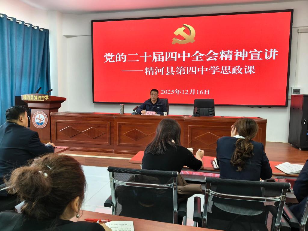 12月16日,精河县委副书记高文生走进精河县第四中学,以“党的二十届四中全会宣讲”为主题,为全校教师讲授了一堂专题思政课。县委教育工委副书记、教育局党组书记、副局长杜萍主持会议。学校领导、教师共120余人参会。