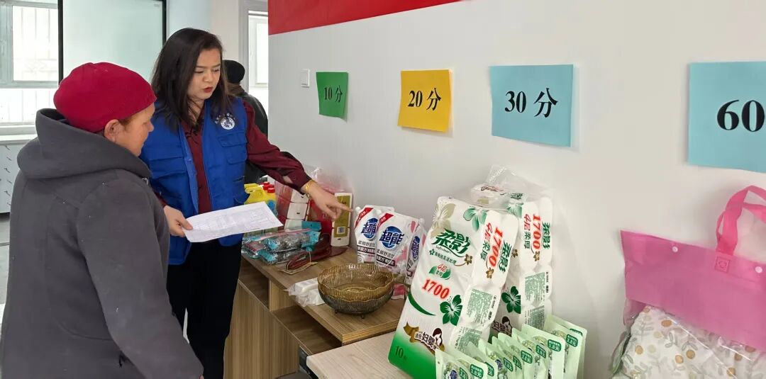 活动现场暖意融融、秩序井然。兑换区内,洗衣液、卫生纸、抹布等各类实用生活用品整齐陈列,涵盖居民日常所需,不同物品对应不同积分分值,方便居民根据自身积分情况和实际需求灵活选择。居民们手持积分手册有序排队,在工作人员的引导下,有条不紊地完成积分核对、物品挑选、登记领取等流程。