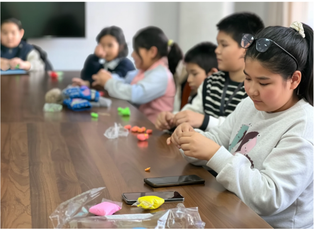 活动现场宛如色彩乐园。长桌上铺满彩虹色系彩泥与塑形工具,孩子们指尖翻飞,全神贯注开启创作之旅。社区工作人员化身“手工导师”,首先向孩子们展示了多款精美的彩泥作品,包括憨态可掬的小动物、娇艳欲滴的花朵、精致小巧的水果,以及充满童趣的卡通形象。这些作品瞬间点燃了孩子们的创作热情。随后,工作人员耐心讲解彩泥的揉捏、按压、塑形技巧,并手把手指导孩子们从基础造型入手,一步步打造属于自己的作品。扎着小辫的女孩专注地捏着兔子耳朵,不时对比参考图调整造型;邻桌的男孩将红黄蓝三色彩泥糅合,创作出“彩虹恐龙”的独特纹理;几位小朋友自发组成“手工小分队”合作完成了一个微型动物园。“大家快看!这是我做的太空飞船!”可爱的苏莱曼高举作品,脸上满是自豪。