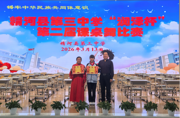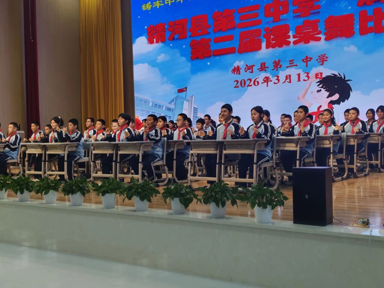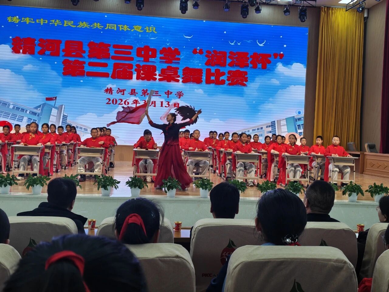 “双减”之下,美育润心。3月13日,精河县第三中学第二届“润泽杯”课桌舞比赛在校园内火热开赛。同学们以课桌为支点,以红歌为背景,用充满力量与美感的动作,舞出了新时代青少年的蓬勃朝气,也为校园文化生活增添了浓墨重彩的一笔。