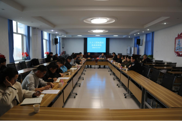 首先在八十三团桌面演练现场,37名参演人员迅速集结就位,模拟团场及周边区域发生破坏性地震。演练开始后,八十三团相关部门迅速进入应急状态,依据《八十三团地震应急工作方案》,围绕震情速报、先期处置、力量调派、群众转移安置、基础设施抢修、信息发布与舆论引导等多个环节,进行了全流程、全要素的桌面推演。参演人员密切配合、会商研判、果断决策,重点检验了兵地之间信息共享、指令通达、资源互补的协同效能。