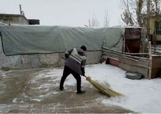 精河县阿合其农场农三队居民依力·艾麦提在打扫庭院卫生