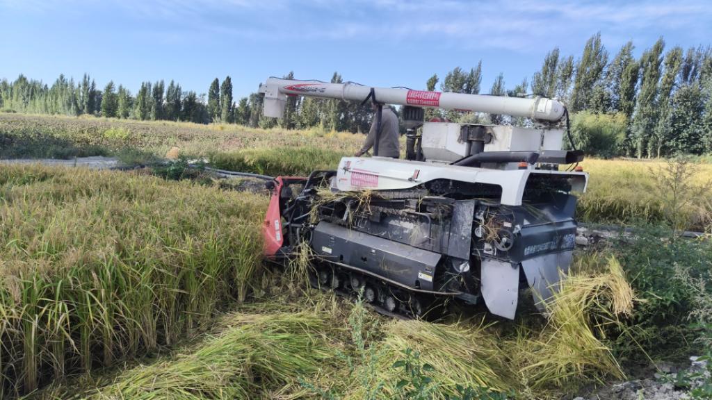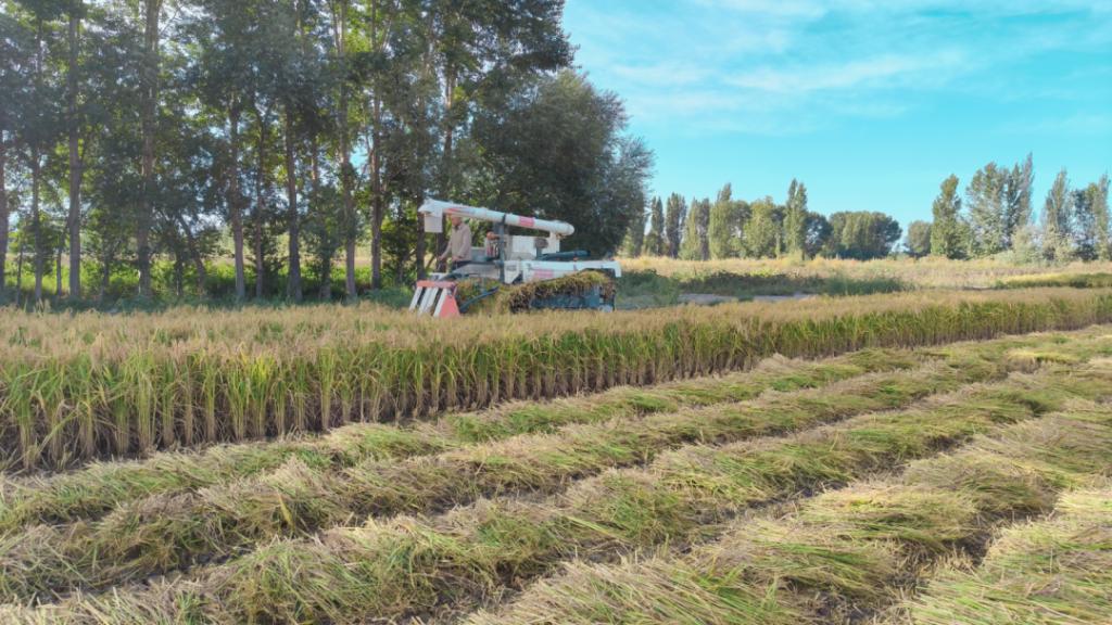 金秋九月,正是水稻收割的好时节,精河县茫丁乡五棵树的水稻田田间地头,空气中到处弥漫着稻谷的清香味。微风拂过,一望无际的稻田像铺了一地的金子,泛起层层金色波浪。放眼望去,一台台收割机正忙碌穿梭于田间,一幅幅美丽生动的乡村丰收盛景图在田间地头精彩铺开。