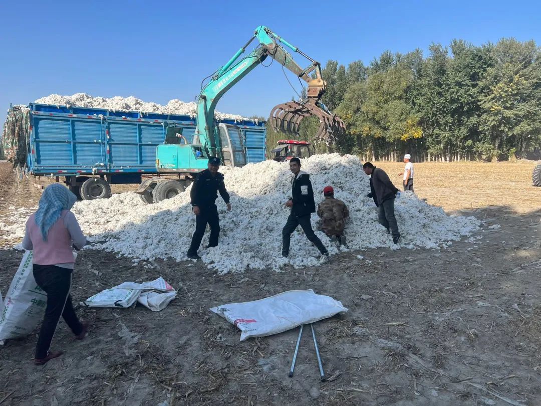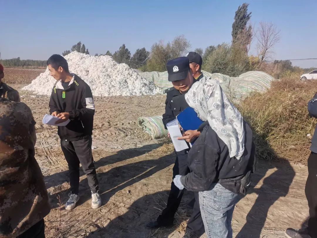 为切实保护棉农的财产安全,10月12日,沙滩村联合警务室到田间地头和轧花厂检查棉农的推垛情况,现场告知棉农不要使用明火,做好棉花堆垛的防火措施。