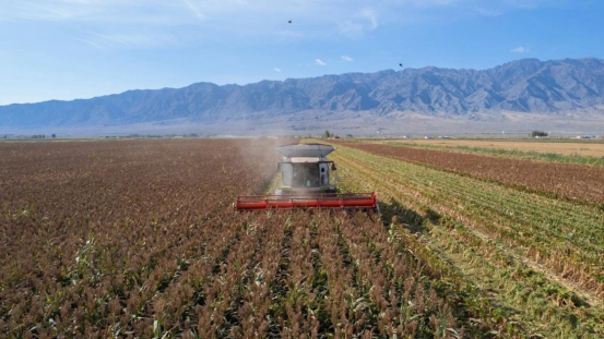 种植户脸上都洋溢着丰收的喜悦,高兴地说:“今年的高粱收成很好,高粱穗个个都长得籽粒饱满,大型收割机收割也快,省时省力,特别的方便。”