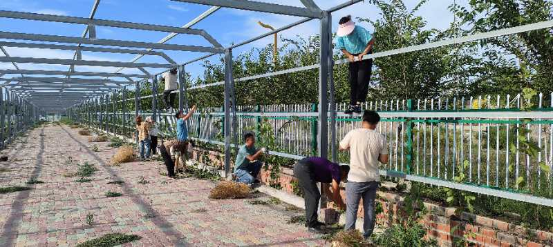 干部们分成两组,头顶烈日、不顾酷暑,一组人拿着剪刀修剪,上架后,一棵棵葡萄藤像绿色哨兵一样,整齐划一、昂首挺胸地站立在葡萄架上,为美丽乡村增添了一道亮丽风景。另一组干部们化身为“除草能手”,对葡萄沟两侧公共区域、绿化区域,开展杂草清理,针对不同程度的杂草采用不同的清除方式,对于根系松软的直接用手拔除;对于根系发达的连成片的杂草,借助镰刀、铁锹等工具合力清除,并及时清扫、清运杂草。