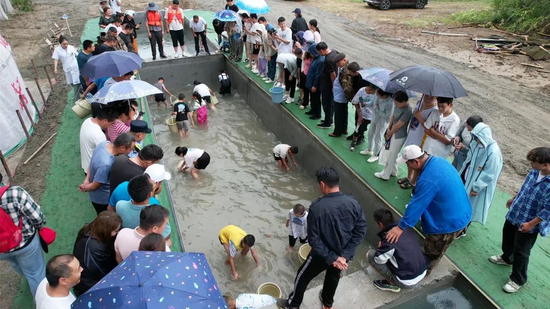 “鱼”你同乐趣味摸鱼活动。在摸鱼活动区,选手们卷起裤腿,挽起袖子,伴随着主持人一声令下,纷纷涌入水池之中,竞相摸鱼,激烈角逐。孩子们肆意奔跑在泥塘,体验开盲盒般的快乐,一片沸腾,欢呼声、呐喊声、尖叫声此起彼伏,谱写出了一曲乡野交响曲。