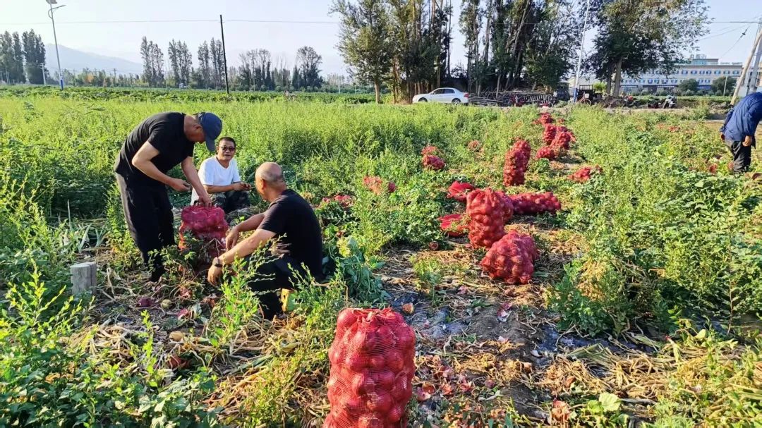 盛夏时节,精河县茫丁乡东关村的洋葱种植地块迎来丰收。洋葱田中,村民们麻利地收割、分拣、装袋。田垄边,紫红饱满的洋葱堆积如山,与农户忙碌的身影、满载的运输车辆交织成一幅动人的丰收画卷。
