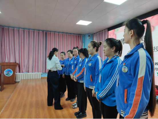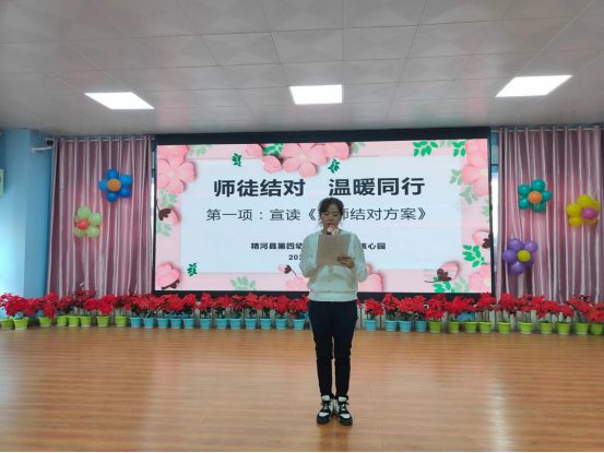 活动伊始,精河县第四幼儿园副园长吴婷宣读拜师结对方案,明确师徒各自的职责,接着,由精河县第四幼儿园保教主任王惠惠宣读师徒结对名单,共有27位教师结成11对师徒,随后,精河县第四幼儿园党支部书记郭爱娟给师傅们佩戴帮带师傅胸牌,一个胸牌,承载的是沉甸甸的嘱咐和责任。