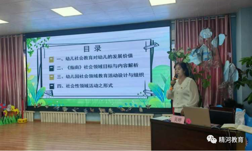 精河县第四幼儿园副园长吴婷给大家带来题为《(指南)背景下幼儿园社会领域活动的设计与组织》的专题讲座。精河县第四幼儿园孙晓敏和大河沿子镇第一幼儿园江娜尔老师各上了一堂社会活动课《保护动物的家园》,两位老师运用不同的教学方式让幼儿在游戏中学习,在学习中游戏。课后,现场观摩教师对两节课进行专业的评价。