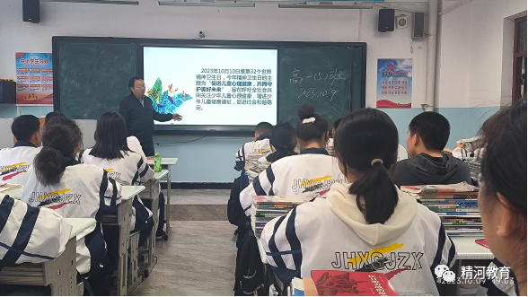 在主题班会中,各班班主任带领班级学生通过2023年10月10日世界精神卫生日宣传海报、心理健康素养十条、青少年常见的心理问题以及心理健康教育策略展开学习。