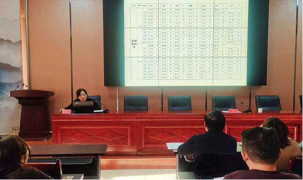 会上,教研中心副主任王俊卿针对全县九年级联考成绩进行整体分析,通过数据把各校总平均分、单科平均分进行对比,又和去年八年级成绩跟踪对比找差距,通过详实的数据,深刻剖析了各校的教学现状及存在的问题。