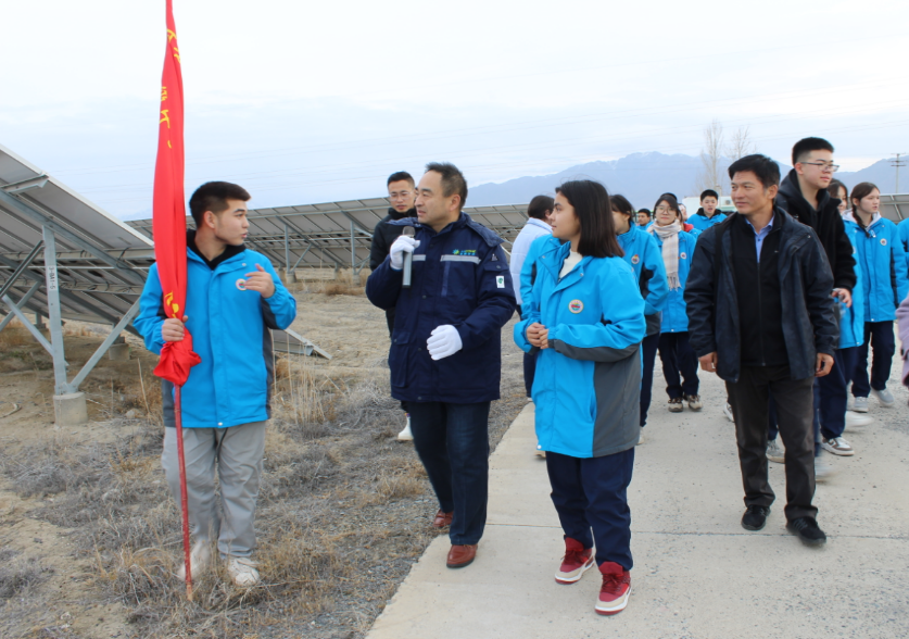 同学们还沉浸在梭梭林的热烈讨论中,大巴车已经行驶到精河县浙江能源光伏电厂。在能源光伏电厂杨先志师傅的介绍下,同学们了解了光伏发电的特点、什么叫光伏建筑一体化以及太阳能光伏发电的优点。“杨老师,光伏发电有什么优点吗?”高一11班艾合散同学提问到。“光伏发电的优点很多,比如清洁、安全和可再生的能源,整个系统无机械运动部件,不产生噪声......”杨师傅认真为在场师生进行解答。
