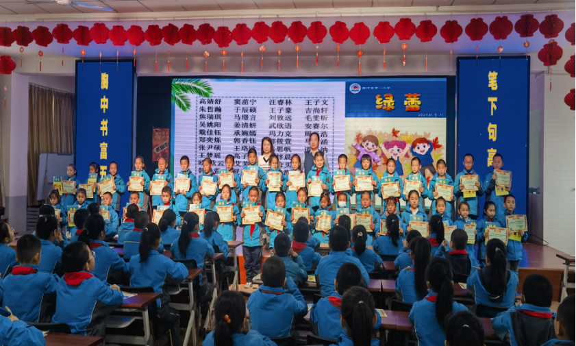 蔡书记、朱慧萍副校长及文学社的老师们为本期小作家们颁发喜报、赠送《绿蕾》秋季刊。