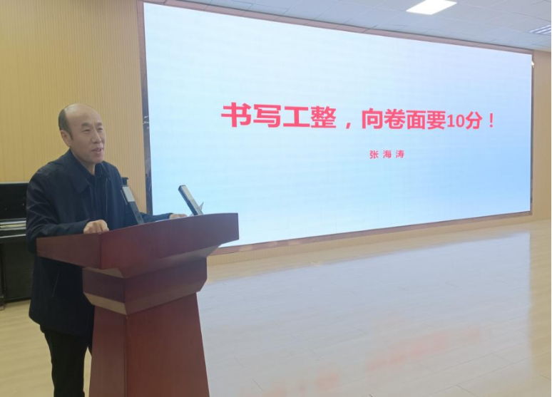 副校长张海涛针对高考中书写不规范的问题,开设了“书写工整,向卷面要十分”的讲座。讲座从高考对卷面书写的要求;卷面书写工整的具体策略;书写规范;优秀卷面赏析等四个方面展开。