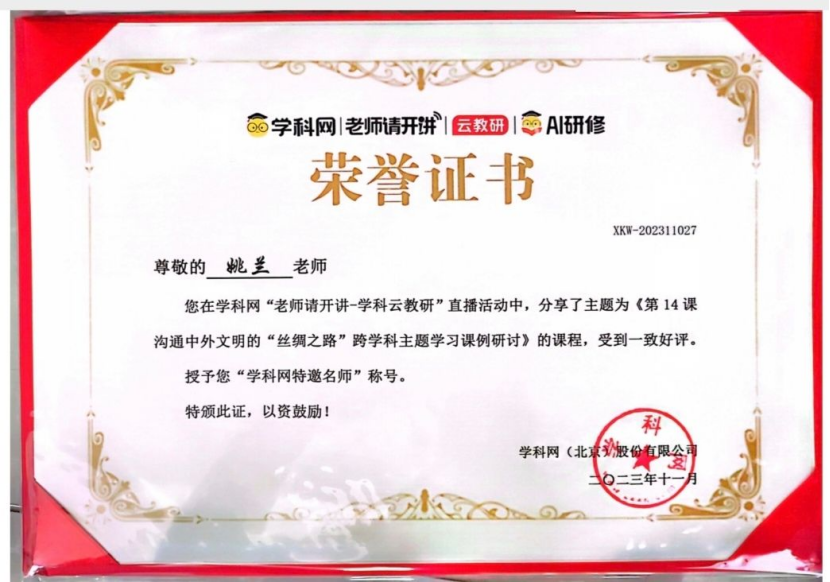 据悉,姚兰系襄阳五中精河分校资深历史教师,自2020年确立为博州高中历史名师工作室主持人以来,在“以师育师”方面,一直秉承“立己达人 胸怀天下”的室训,聚焦“深研精教,引领辐射”的目标带领一群有情怀的历史人,牢记“躬耕教坛 强国有我”的使命,在课程设计、命题方面协办课件大赛、组织成员参与命题比赛,进行课例分享、工作室经验分享,不断发光发热,赋能历史教师专业成长。