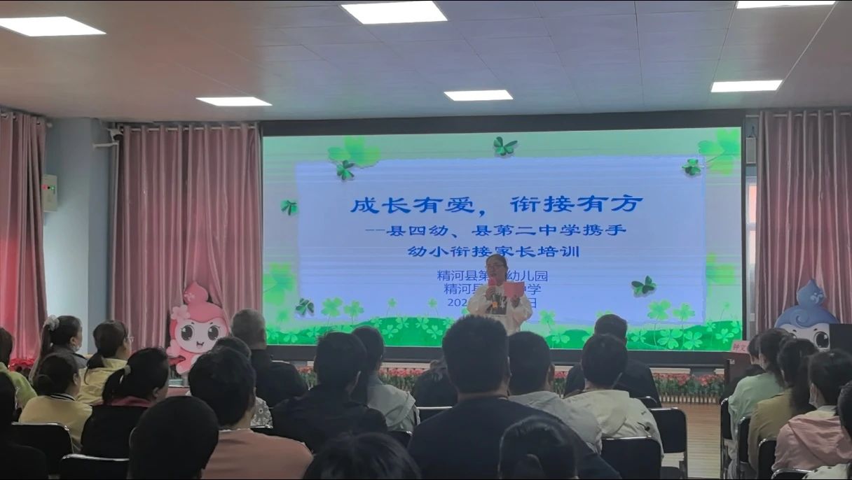为共聚家校合力,科学做好幼小衔接工作,4月11日,精河县第四幼儿园携手第二中学召开以“成长有爱,衔接有方”为主题的家长专题培训会。