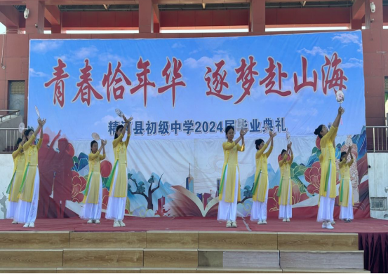 同日,精河县初级中学“青春恰年华 · 逐梦赴山海”2024届毕业典礼活动在一首充满朝气的歌曲《少年》中拉开帷幕,接着《舞蹈串烧》《把未来点亮》《成长是首歌》等精彩节目轮番上演,舞蹈、独唱、朗诵等形式多样的文艺表演让现场高潮迭起。特别是八年级(6)班表演的古诗词诵读《小雅·鹿鸣》,传承了国学古风,赢得了九年级学生的阵阵掌声。