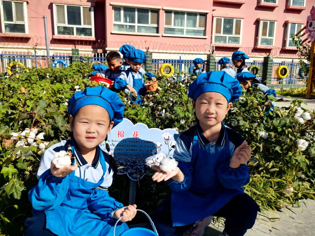 精河县第四幼儿园门口,小朋友们和毛茸茸的米奇、熊熊抱一抱,击掌欢呼。进入园内,穿着“米老鼠”“大熊猫”衣服的老师为小朋友送上新的班牌,大一班玛丽娜·阿力玛斯的爸爸大清早就带着女儿来到了幼儿园,“以这样特别的形式开启新学期第一天,我家姑娘高兴极了,孩子们还开展采摘活动,一朵朵洁白的棉花、绿色无公害蔬菜,让她们在劳动中体验收获的喜悦!”