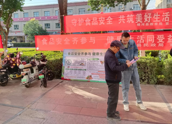 在精河县友好广场食品安全宣传周启动仪式现场,县教育局工作人员围绕食品安全法、如何预防食物中毒、如何健康饮食等内容,通过悬挂横幅、摆放展板、发放宣传单、现场宣讲等多种方式,向群众普及食品安全知识,进一步增强人民群众食品安全意识,提高防范能力。