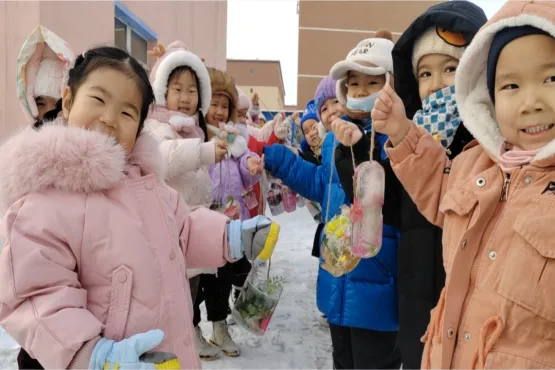 经过一晚上的冰冻,孩子们制作的冰块变成独一无二的艺术品,轻轻地取出,将彩色冰块挂在树上,为冬日的校园增添了多彩的氛围。中一班夏克如·帕尔哈提小朋友说:“太神奇了,鲜艳的花朵长在晶莹剔透的冰块里,它是最漂亮的。”
