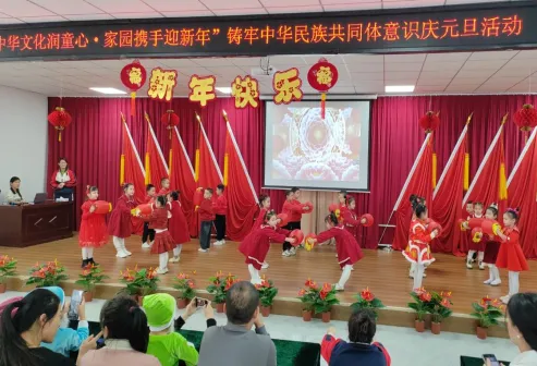 幸福、河西村幼儿园师生来到精河镇友好社区,开展了文艺汇演、亲子游戏、“铸牢中华民族共同体意识”趣味问答等丰富多彩的活动,和居民朋友一起迎接新年的到来。孩子们通过红歌展演《爷爷为我打月饼》、诗歌朗诵《唐诗里的中国》、课本剧《白雪公主》、歌舞表演《苹果香》、舞蹈串烧《一起ZAO》等多种形式,一起感受节日的喜庆和中国传统文化的魅力。亲子舞蹈《福气要来到》和走秀《盛世中华》中,家长和孩子们身着各民族的华服,载歌载舞,完美诠释了什么是“五十六个民族,五十六朵花”,深切感受到中华民族亲如一家。“铸牢中华民族共同体意识”有奖趣味问答,将本次的活动推向了高潮,家长和孩子们争先恐后地抢答着,在轻松愉悦的问答中,中华文化浸润着每一个孩子的心田。