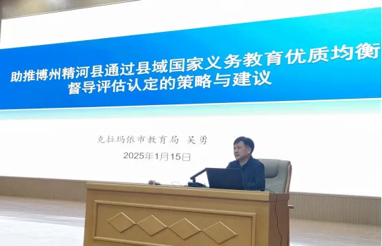 为给博州教育提供专业的指导和引领,克拉玛依市教育局基础教育监测中心主任吴勇主任在《助推博州精河县通过县域国家义务教育优质均衡督导评估认定的策略与建议》专题讲座中,从创建国家义务教育优质均衡县的背景及意义、县域义务教育优质均衡标准等7个方面,阐述了如何根据质量监测结果精准定位教学目标、优化教学内容和教学方法,为教师们提供了科学的教学指导和建议。吴勇主任的讲座深入浅出、生动形象,赢得了参会教师的阵阵掌声和高度评价。