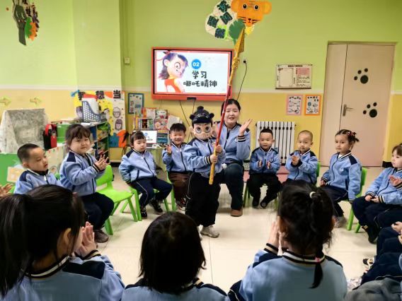 在精河县第四幼儿园,老师们装扮成“哪吒”的形象,手持风火轮和混天绫,站在园门口迎接孩子们的到来。孩子们一进门,就被“哪吒”的可爱造型吸引,纷纷上前合影留念。家长们也表示,这样的迎接方式让孩子们对幼儿园充满了期待,缓解了分离焦虑。