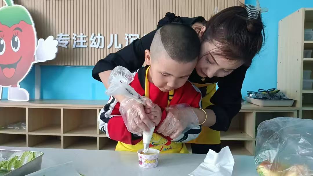 走进杞宝生活馆,伊力达尔的妈妈正带着孩子们享受“甜蜜烘焙时光”,孩子们热情高涨,积极参与,小手虽然稚嫩,但学得有模有样,搓、揉、挤、捏,每一个步骤都充满了童真与好奇。