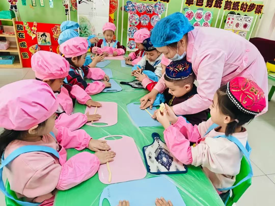 走进大四班,阿茹娜妈妈将教室变成梦幻厨房,教孩子们制作小麻花,孩子们戴着迷你厨师帽,在称量砂糖、揉捏面团中感受“食物魔法”。