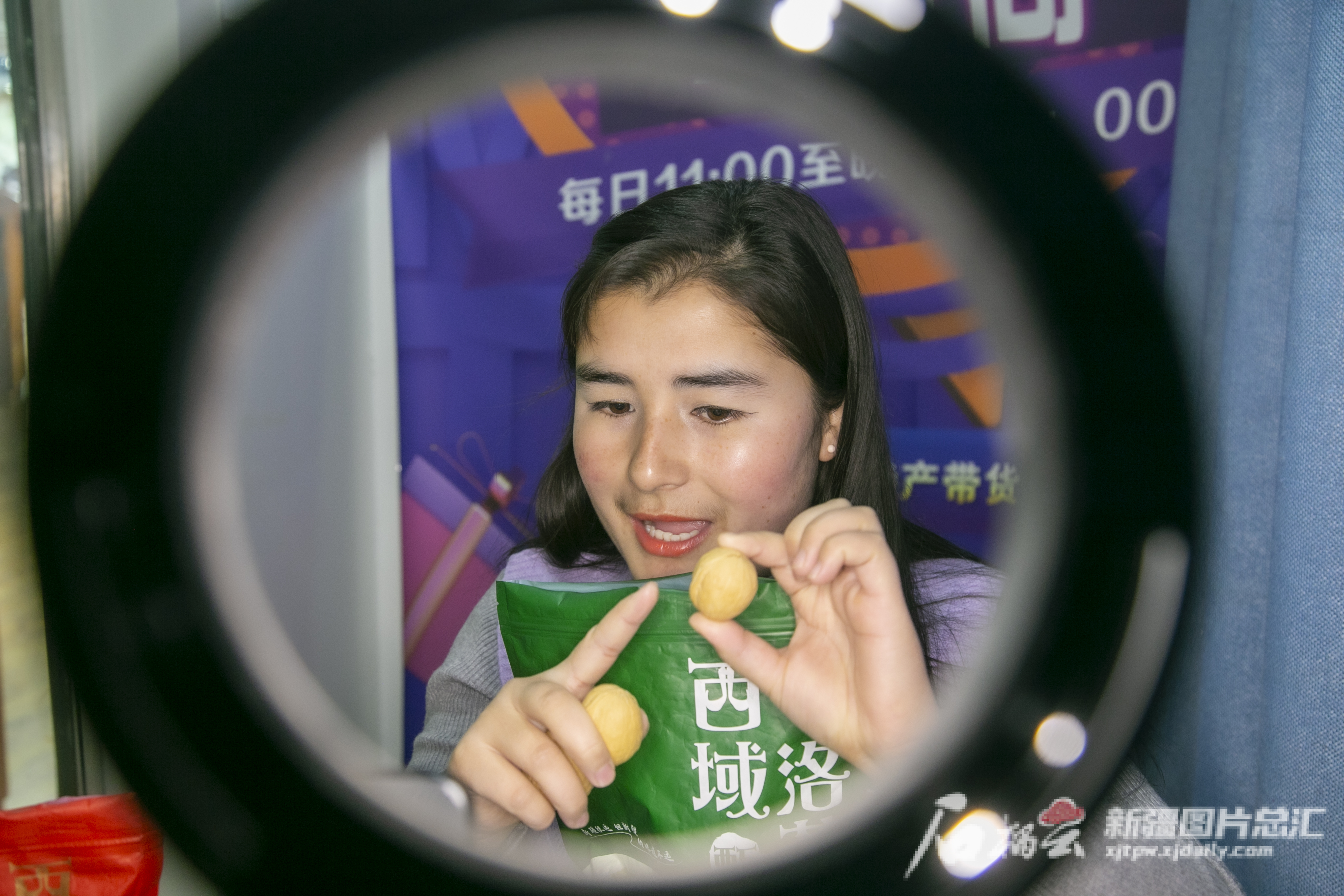 在洛浦县电子商务产业园,洛浦洛蓝农副产品专业合作社主播努尔曼古丽·图尔荪江正在直播带货。买买提艾力·艾尼瓦尔 摄