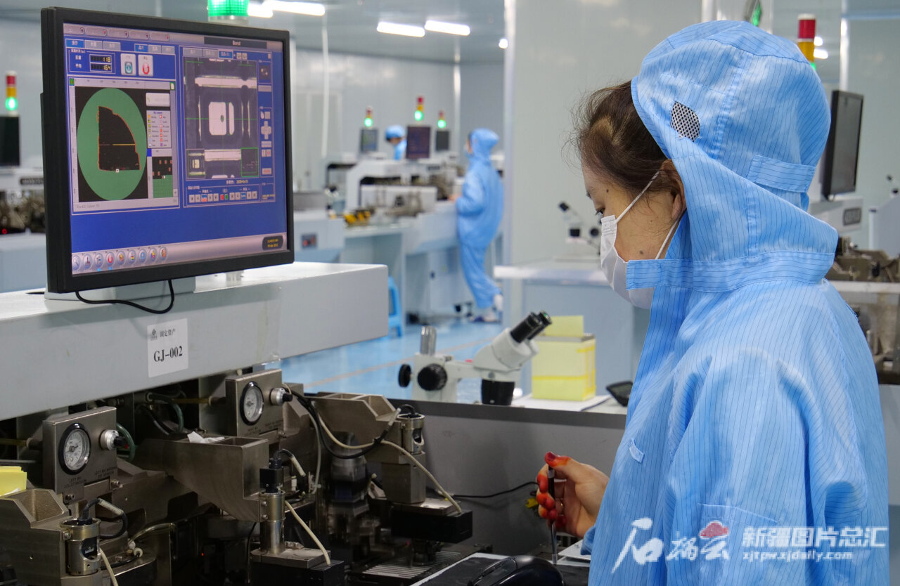 2022年8月4日,霍尔果斯三优富信半导体精工有限公司员工在生产车间操作智能设备生产。李勇 摄
