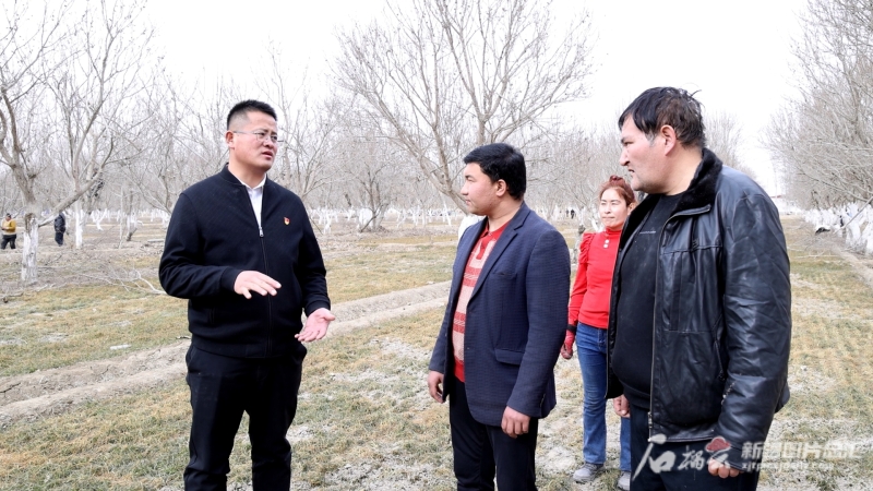 2月16日,全国人大代表、莎车县巴格阿瓦提乡党委书记逄子剑(左一)在田间地头与村民交流。图片由逄子剑提供