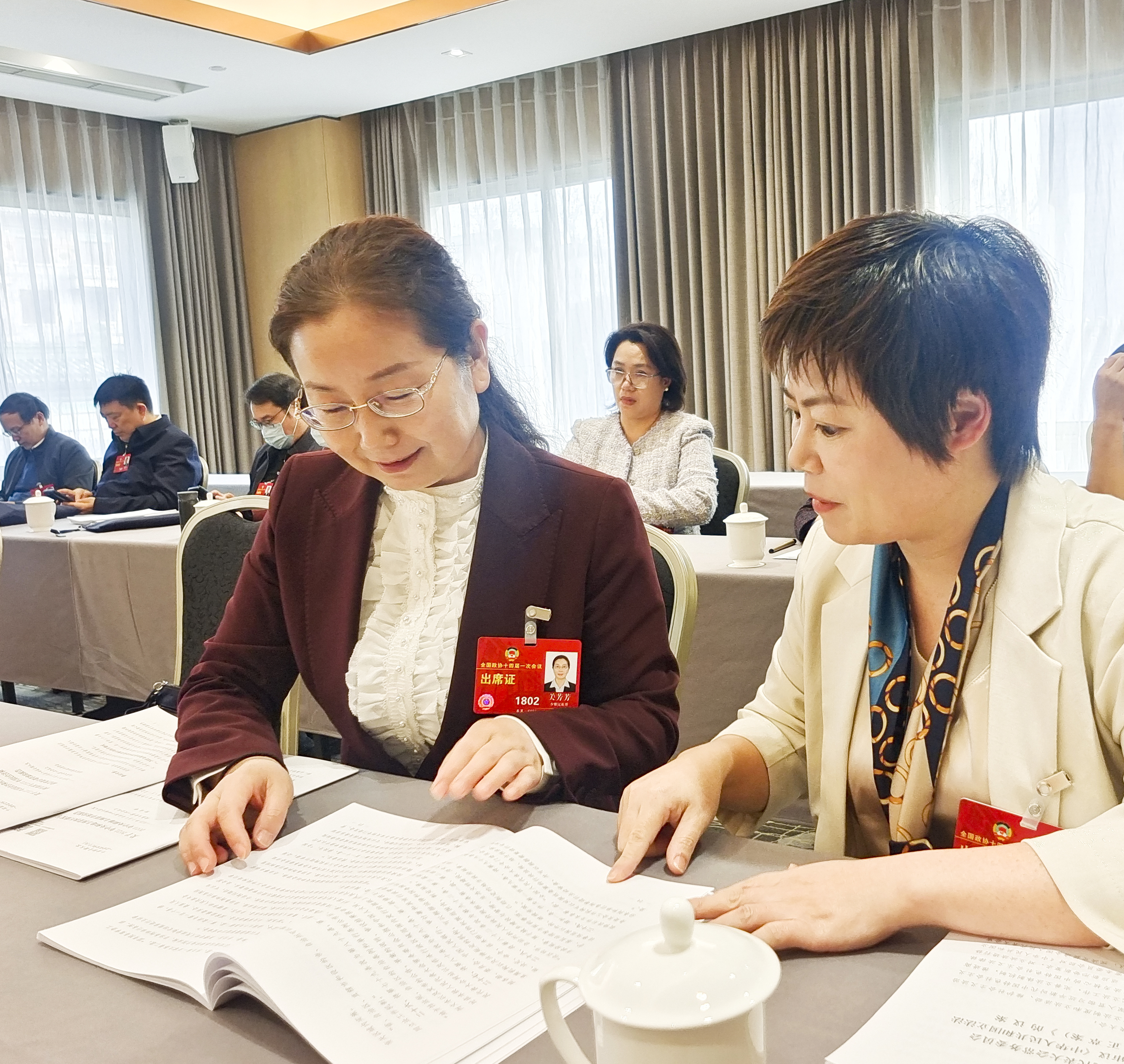 全国政协委员、察布查尔锡伯自治县教育局招考中心主任关芳芳(左)在全国两会上与其他委员交流。