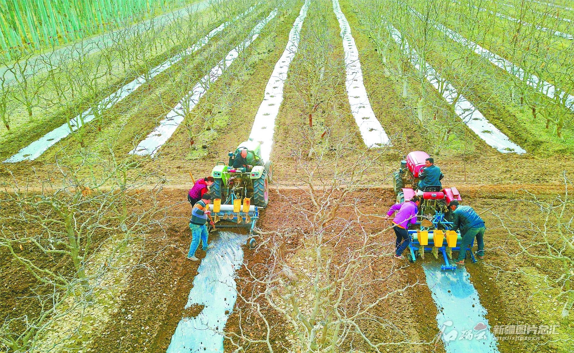 3月16日,村民在枣园套种西瓜。近年来,在“访惠聚”工作队引导下,温宿县依希来木其乡拜什买热克村村民在林下套种西瓜、甜瓜等作物,实现增收。 □艾则孜·沙木沙克摄