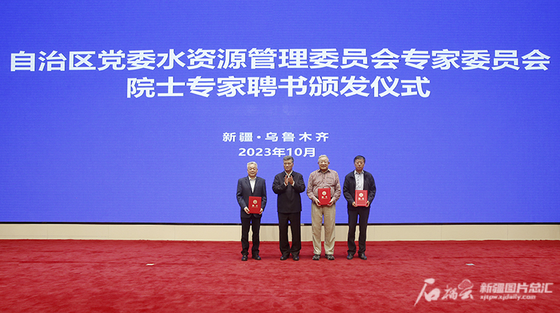 10月8日,自治区党委书记、自治区党委水资源管理委员会主任马兴瑞为自治区党委水资源管理委员会专家委员会院士专家颁发聘书。天山网-新疆日报记者 谢龙摄
