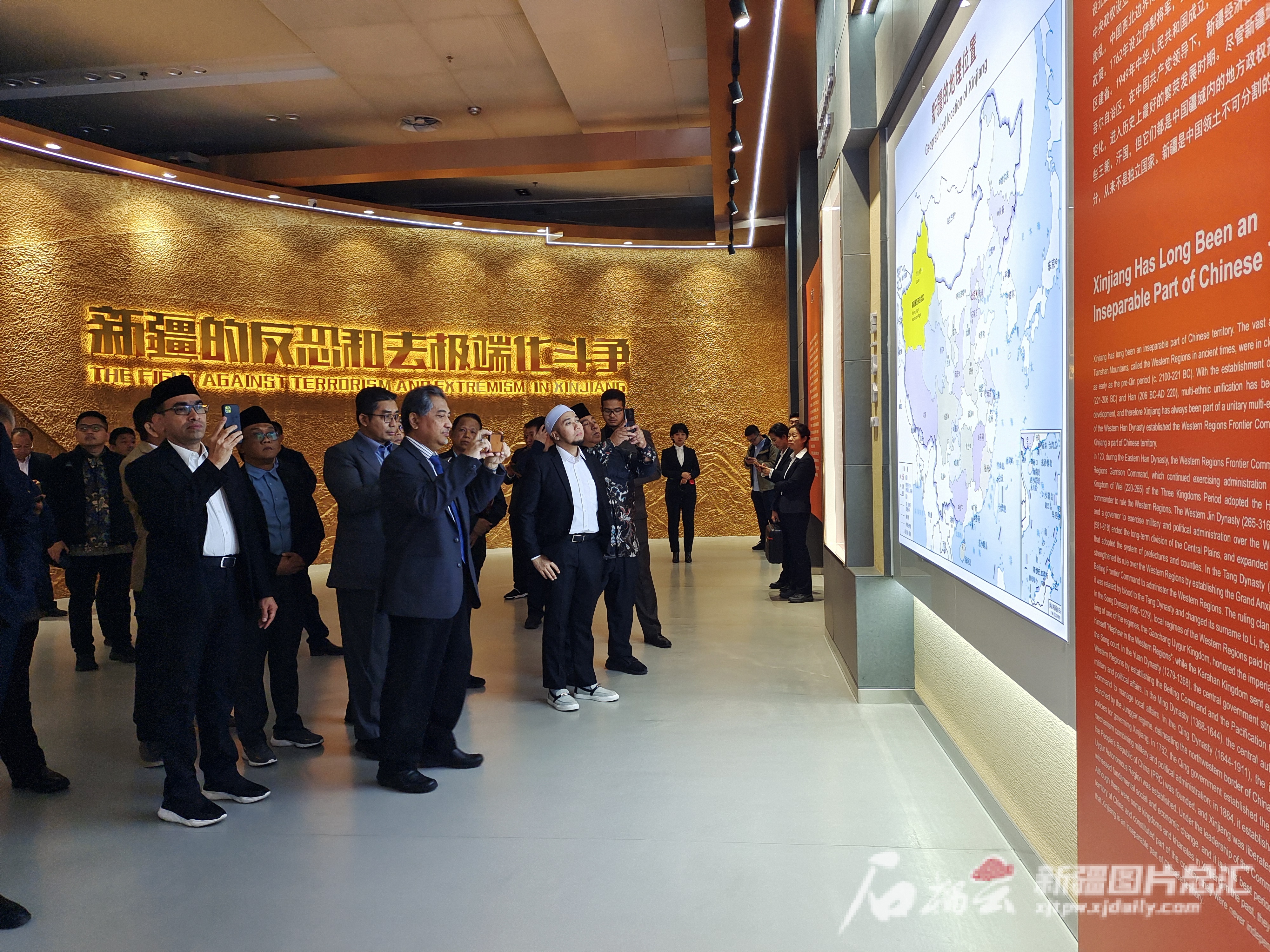 在新疆国际会展中心,代表团一行参观了“新疆的反恐和去极端化斗争主题展”,了解中国新疆反恐和去极端化情况。TvOne副主编埃瑟普·苏瓦达尼亚萨还在现场出镜录制了视频,向印尼亲友介绍新疆真实情况。