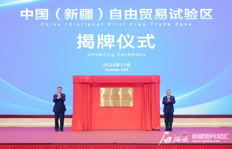 11月1日,自治区党委书记、兵团党委第一书记、第一政委马兴瑞,自治区党委副书记、自治区主席艾尔肯·吐尼亚孜共同为中国(新疆)自由贸易试验区揭牌。石榴云/新疆日报记者 崔志坚摄