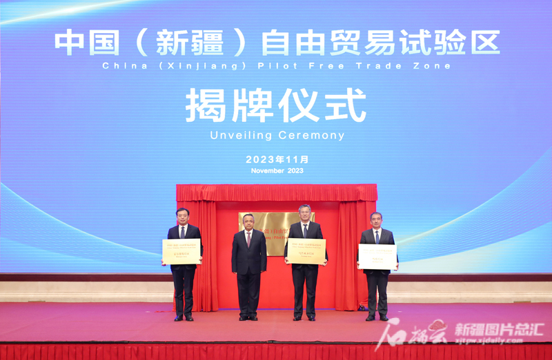 自治区党委副书记、自治区主席艾尔肯·吐尼亚孜参加揭牌并为乌鲁木齐、喀什、霍尔果斯三个片区授牌。自治区党委副书记、兵团政委李邑飞,自治区党委副书记张春林,自治区党委副书记、乌鲁木齐市委书记何忠友出席揭牌仪式。商务部有关同志出席揭牌仪式。