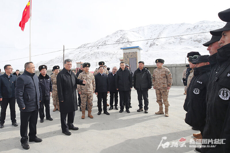 2月3日,自治区党委书记马兴瑞、自治区主席艾尔肯·吐尼亚孜来到新疆军区红其拉甫边防连亲切看望官兵。石榴云/新疆日报记者 崔志坚 摄