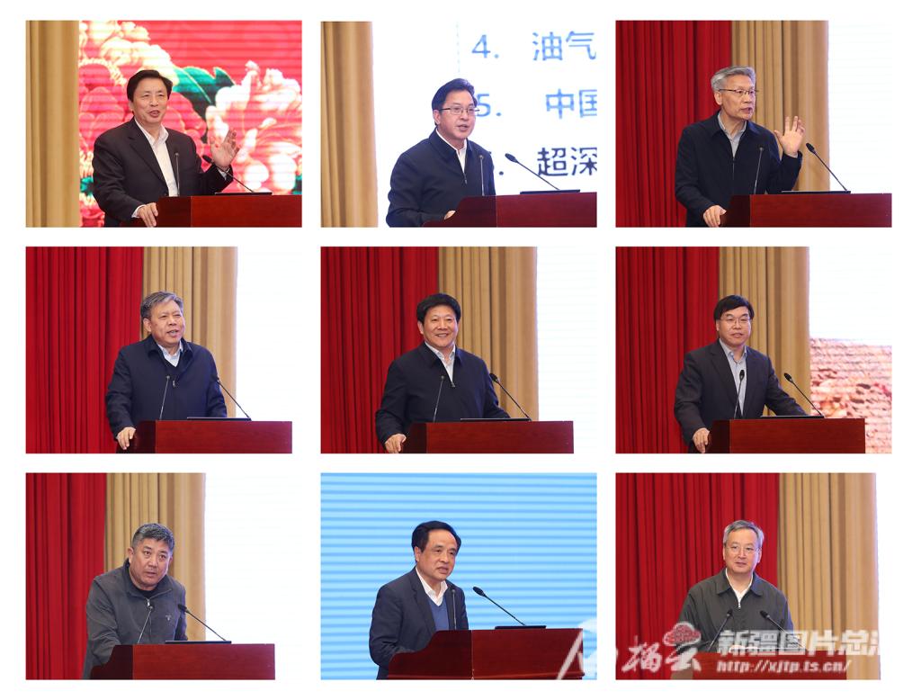 报告会上,两院院士谢和平、孙金声、赵文智、郝芳、李根生、张水昌、刘合、彭苏萍、孙龙德先后作交流报告(从左至右、从上至下)。天山网-新疆日报记者 崔志坚摄